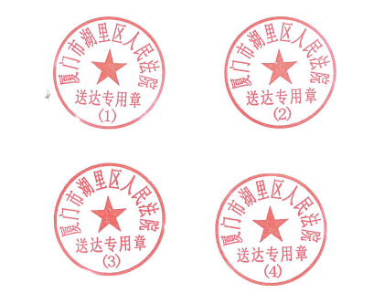 一、送达专用章式样为:圆形,文字“厦门市湖里区人民法院”自左向右环圆排列,正中间为五角星,五角星下方为文字“送达专用章”横向排列,底部刻有序号,分别为(1)(2)(3)(4)。