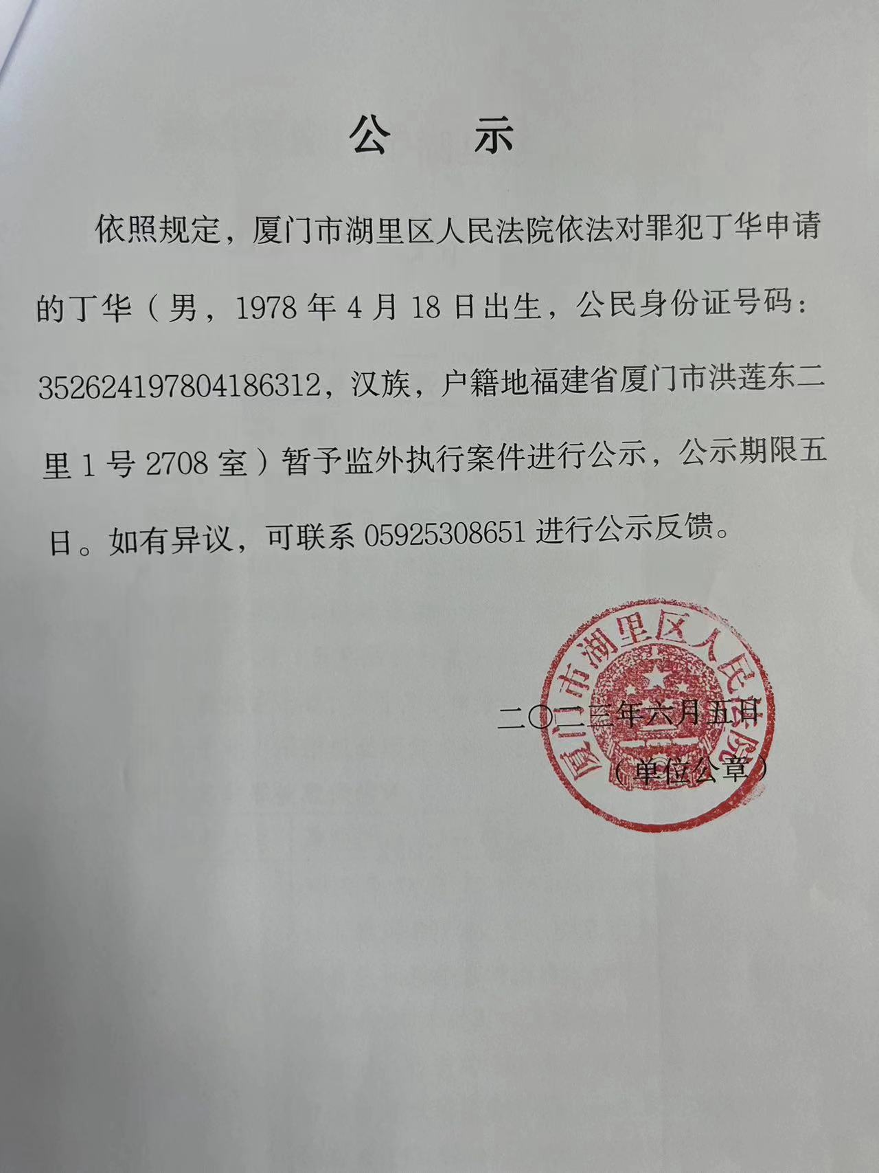 罪犯丁华暂予监外执行一案公示