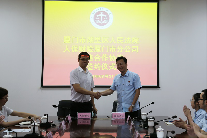 9月21日,我院与中国人民财产保险股份有限公司厦门市分公司签订战略合作协议。一是创新保险项目合作。结合本区法治工作实际,搭建开放性合作平台,创新保险保障机制和交通事故纠纷调解机制,促进提高法院审判执行质效,实现互利共赢。二是加强人才队伍建设合作。双方建立人才双向交流机制,共同做好专业人才队伍的培养。双方定期举办交通事故、保险法、合同法等领域的业务交流、技能培训。 三是建立司法环境建设合作。共同加大打击保险骗赔力度,加强对保险欺诈处罚宣传,定期或不定期联合开展普法活动,定期筛选发布指导性案例和典型案例向社会普及正确的保险消费知识。